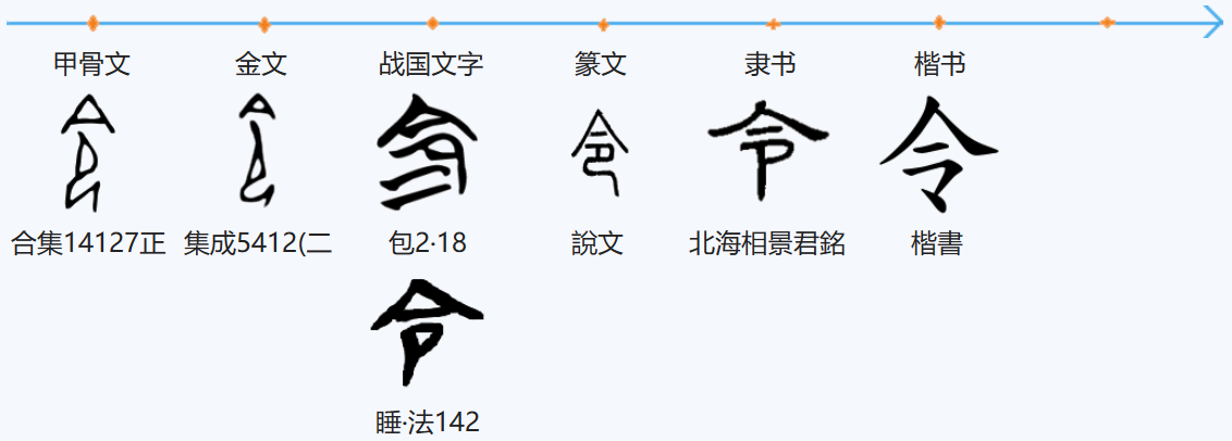 "令"字甲骨文由两个构件组成,今(